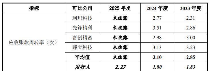财务数据层面,成都超纯材料的争议同样集中。公司应收账款规模居高不下,资金回笼压力持续显现,2023年至2025年,公司应收账款分别为0.90亿元、1.56亿元、2.07亿元,应收账款周转率表现不佳,2023年为1.83次/年、2024年为1.8次/年,2025年虽然有所回升,但整体低于行业平均水平。